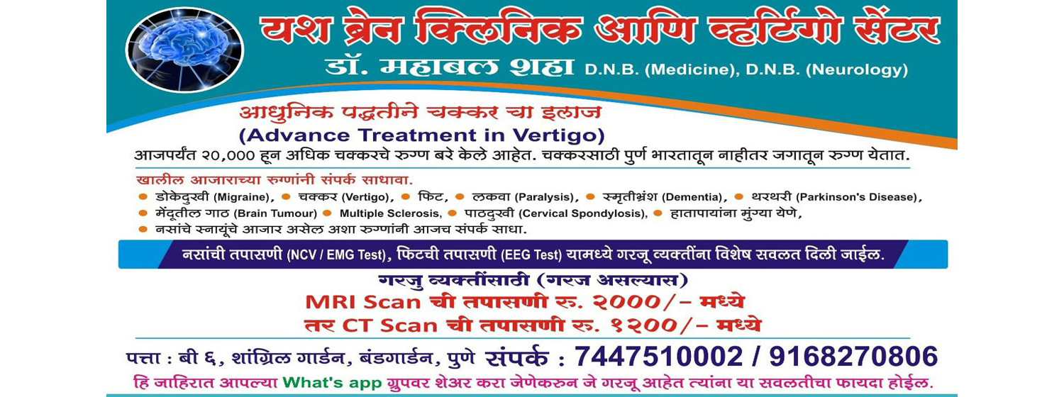 At Yash Brain clinic and vertigo centre, Dr Mahabal shah has a Neurology speciality clinic. Yash Brain clinic and vertigo centre in Bund Garden. We are treating different types of Neurological patients as Headache, Vertigo Epilepsy, Stroke, Paralysis, Dementia, Brain Tumor, Tingling, Numbness. Dr. Mahabal Shah is a consulting Neurologist and vertigo specialist at Yash Brain clinic.